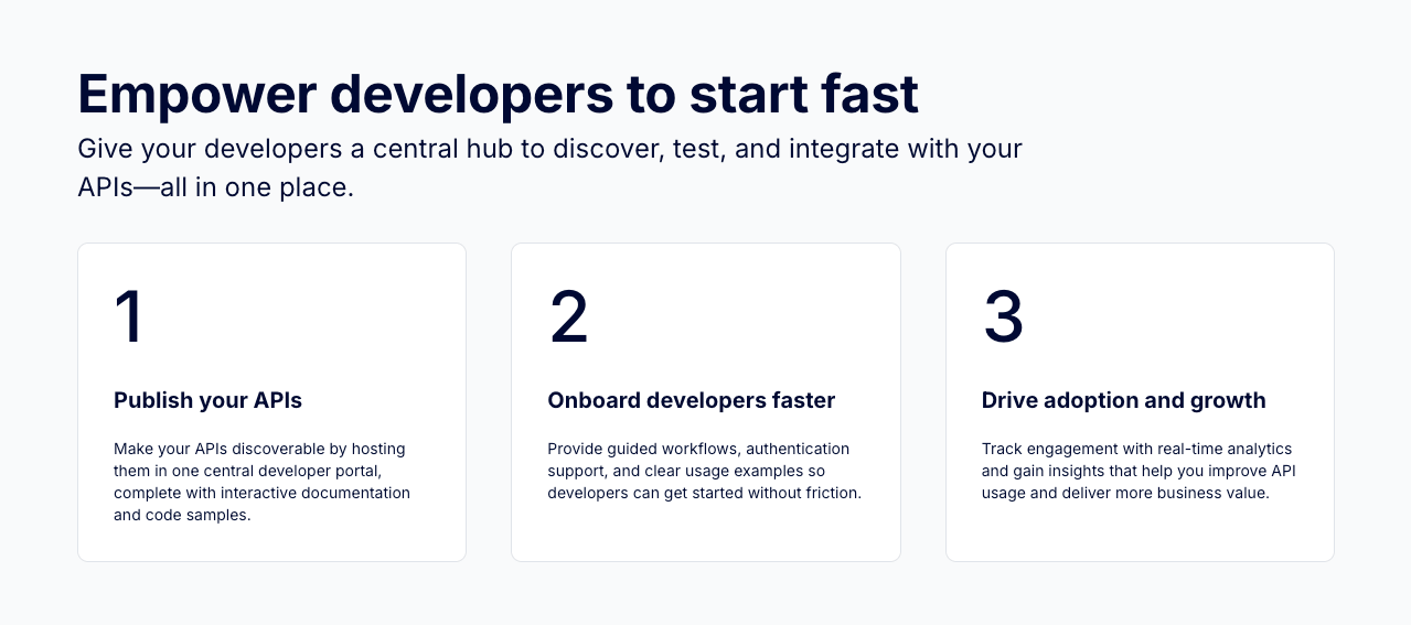 Accelerate your portal design with a curated collection of production-ready sections, including hero areas, calls to action, feature highlights, and FAQ layouts. Each example is responsive, flexible, and built to help you launch a polished developer portal faster.